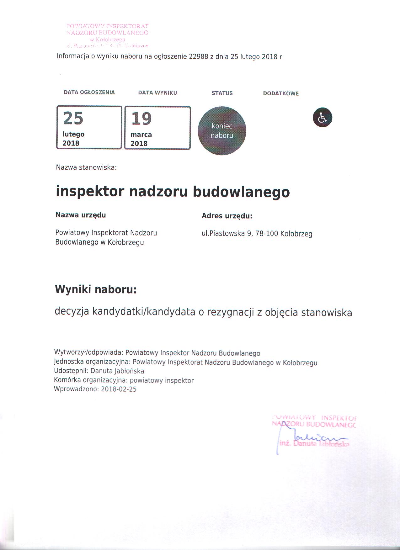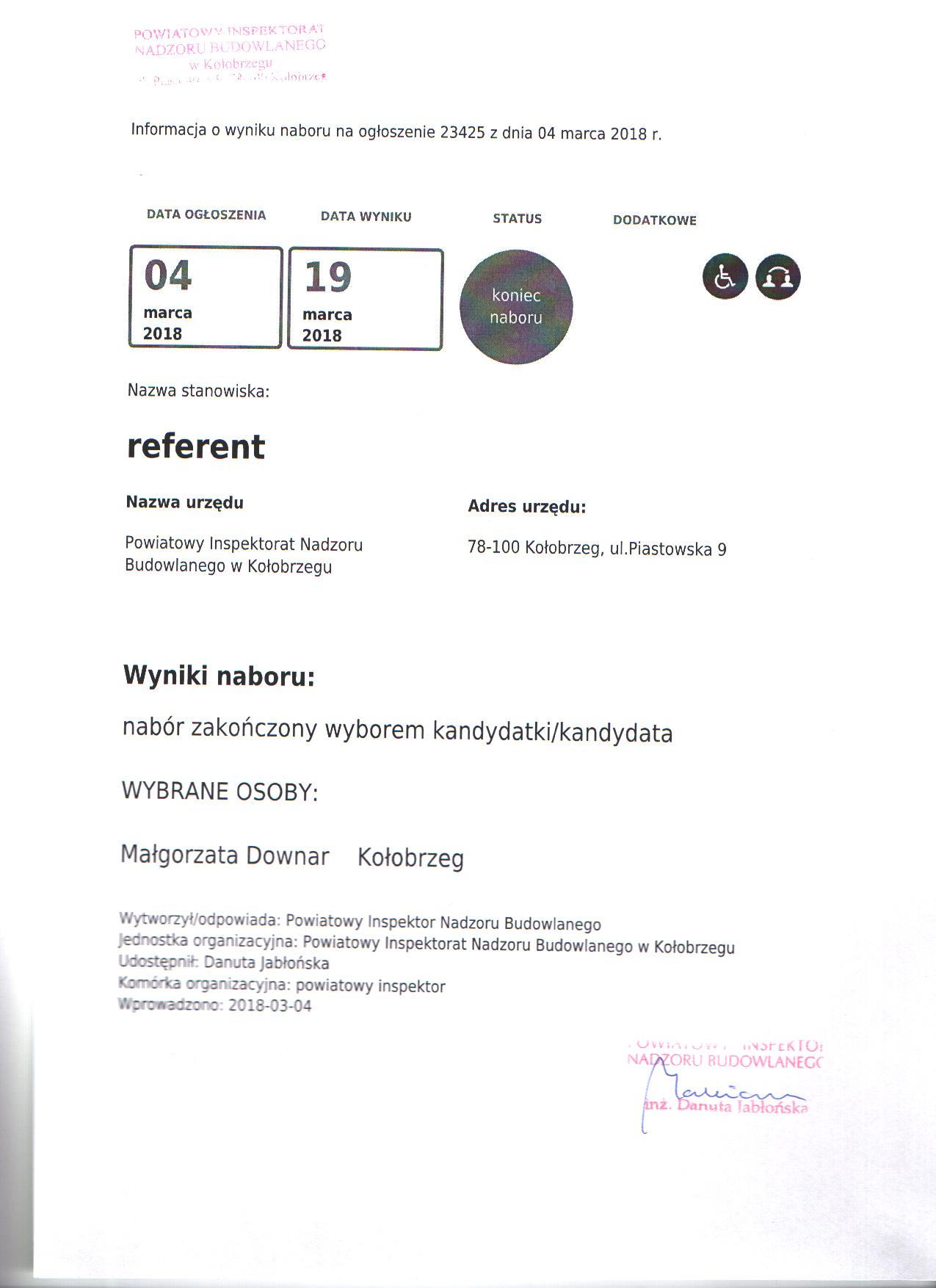 referenta w Powiatowym Inspektoracie Nadzoru Budowlanego w Kołobrzegu.